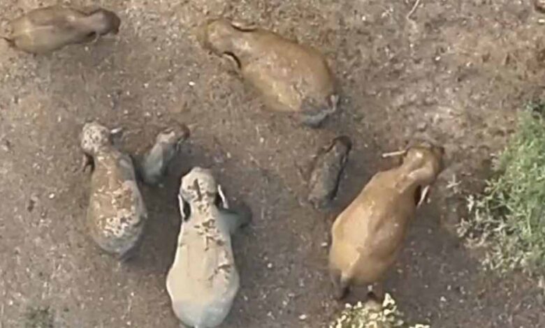 रायगढ़ जिले के जंगल से हाथियों के दल का ड्रोन कैमरे का एक शानदार तस्वीर सामने आई है. 11 हाथियों के दल में दो नन्हे शावक हैं जो अपनी मां के साथ जंगलों में घूमते नजर आ रहे हैं. हाथियों का यह दल छाल रेंज के कुडेकेला परिसर के गूडाघाट डेम किनारे विचरण कर रहा था. वीडियो में देखा जा सकता है कि मादा हाथी अपने शावक को सुरक्षित घेरे में रखते हुए जंगल में आगे बढ़ते नजर आ रही है. बताया जा रहा है कि दोनों हाथी शावक की उम्र करीब 6 महीने के आसपास है.