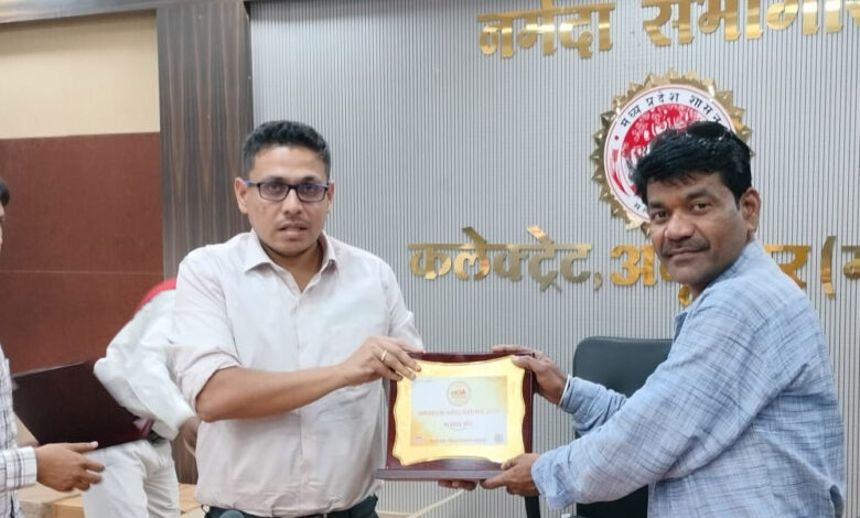 कलेक्टर श्री हर्षल पंचोली द्वारा पत्रकार डल्लू कुमार सोनी को स्मृति चिन्ह भेंट किया