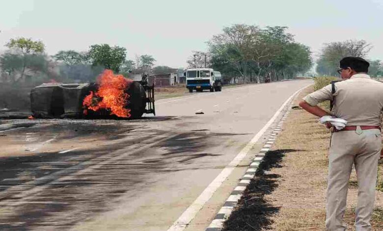 नेशनल हाईवे 30 पर डीजल टैंकर पलटा, लगी आग, ड्राइवर और हेल्पर घायल