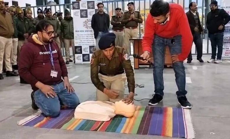 पुलिस के जवान ले रहे सीपीआर देने की ट्रेनिंग