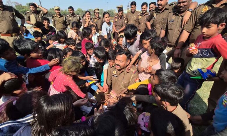 लखनऊ: पुलिस अधिकारियों ने गरीब बच्चों के साथ खेली होली, मासूमों को दिए उपहार