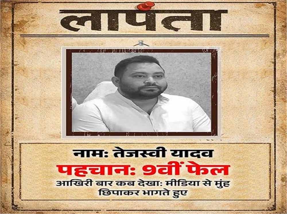 सोशल मीडिया पर पोस्ट शेयर करते हुए बिहार बीजेपी ने लिखा कि लापता का तलाश! नाम- तेजस्वी यादव, पहचान- 9वीं फेल, आखिरी बार कब देखा- मीडिया से मुंह छिपाकर भागते हुए।