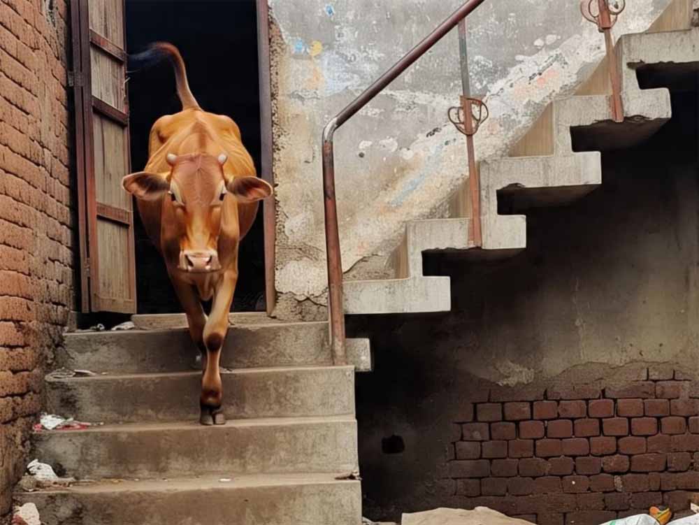 जब आवारा कुत्तों से बचने के लिए एक गाय इमारत की तीसरी मंजिल पर चढ़ी